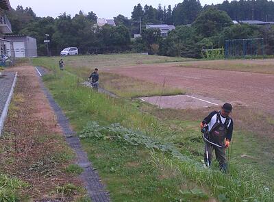 草刈りは、校舎付近の斜面や広い校庭内、フェンス周辺などを刈っていただきました。