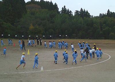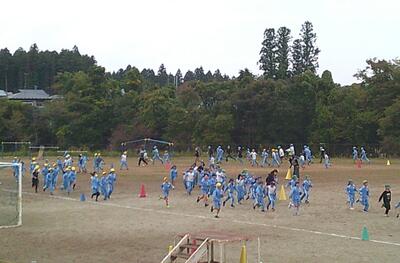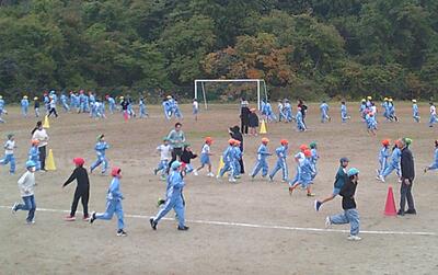 業間の時間を使いながら、自分のペースで5分間走る取り組みです。校庭のトラックの外側は、高学年が走り、トラックの内側を中学年、コーンで仕切られた部分を低学年が走っています。11月12日まで取り組む予定です。