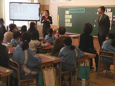 萩荘ふるさと大学の皆さんには、外国語の授業に参加していただき、アルファベットの歌や英語でのあいさつ、自己紹介などを子ども達と一緒になって活動していただきました。