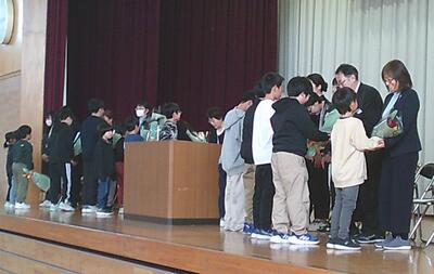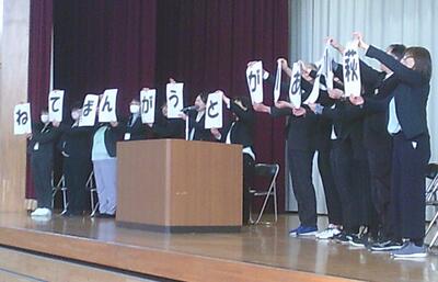 13人の教職員からは、子どもたちに向けて、「萩小っ子ありがとうがんばってね」のメッセージを伝えていただきました。最後には、全校児童でアーチを作り、見送りました。